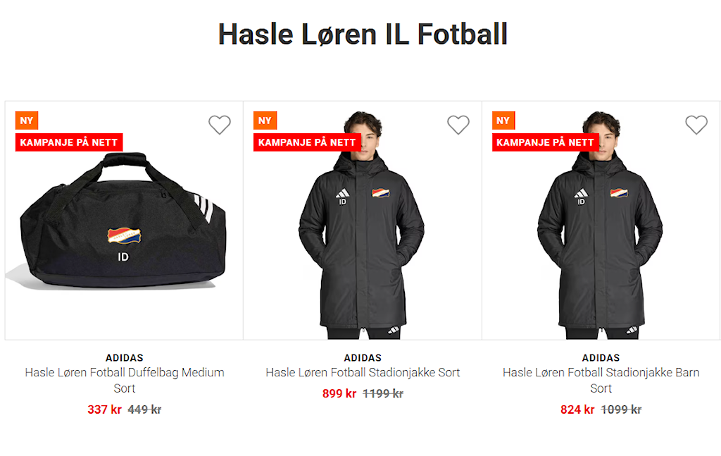 Her finner du utvalget: https://www.torshovsport.no/klubbservice/klubbkolleksjoner/oslo/hasle-loren-il-fotball